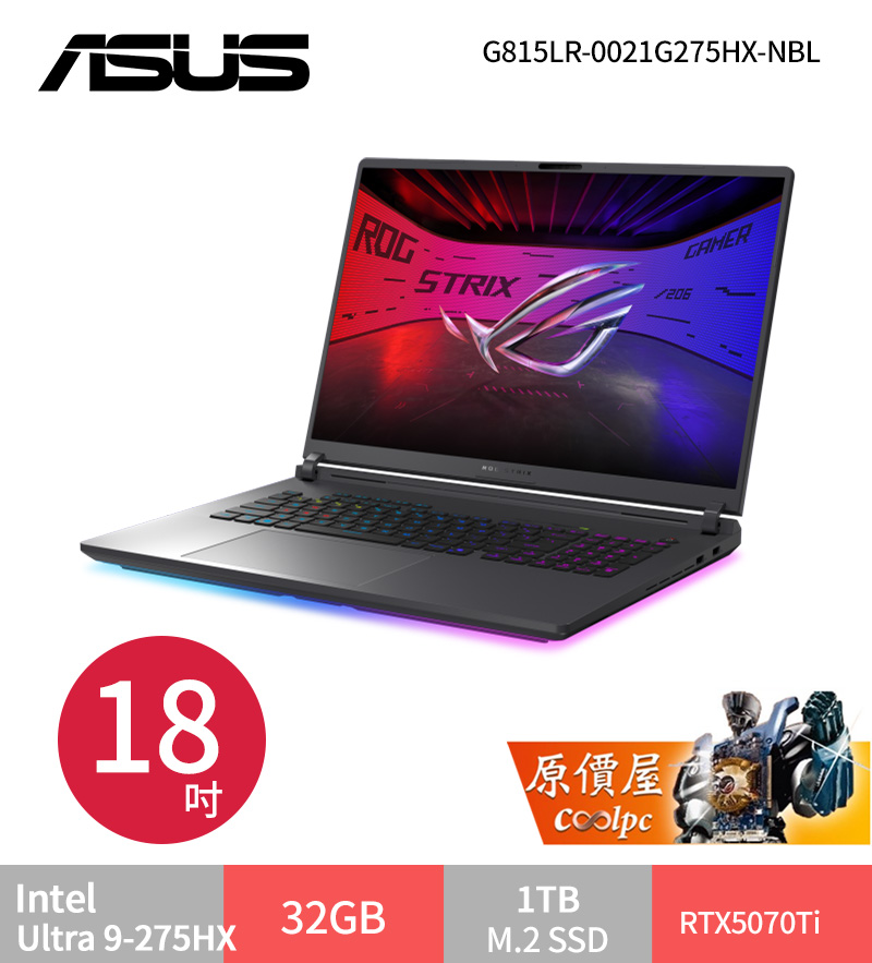 華碩 ROG Ultra 9-275HX/RTX5070Ti/32G/1T/18吋 電光綠 G815LR-0021G275HX-NBL $79999>蝦皮商城>官網