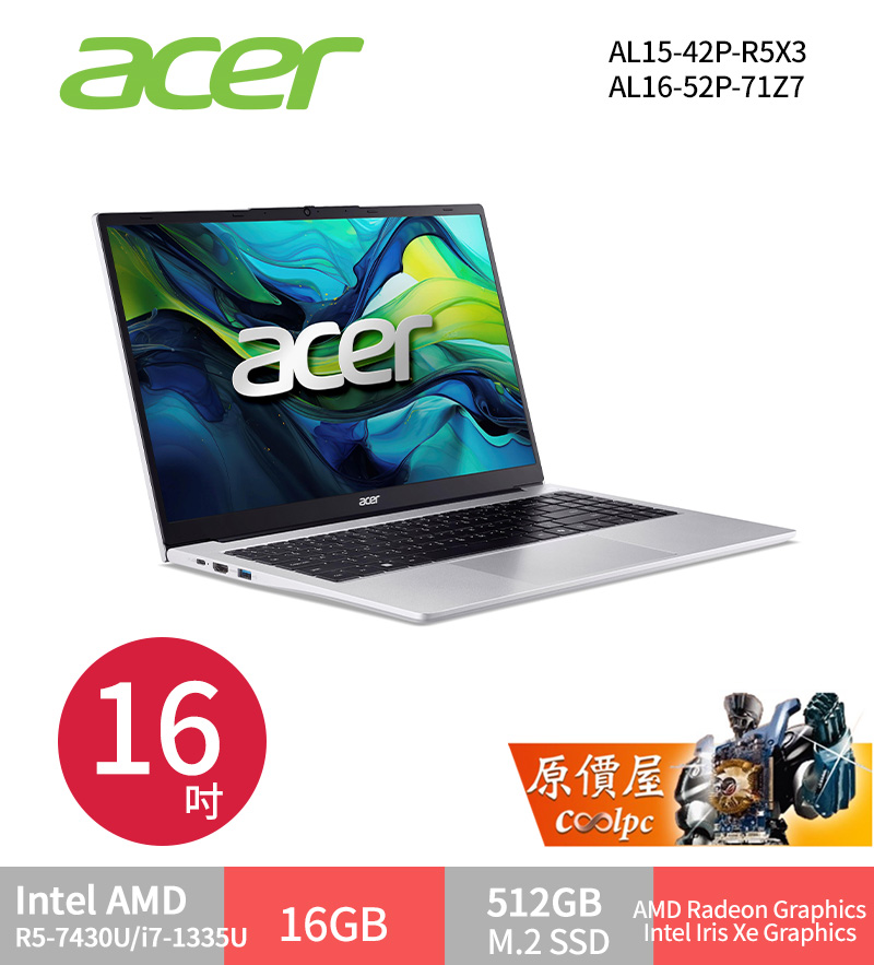 Acer Aspire Lite /i7-1355U/16G/512G/16吋/銀 AL16-52P-71Z7〈Win11 Pro系統〉 $26900>蝦皮商城>官網