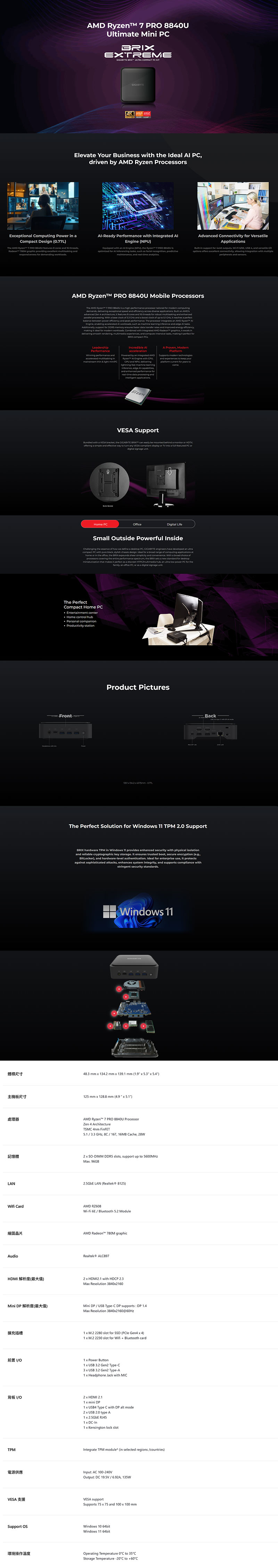 .GIGABYTE BRIX【GB-BER7-8840】R7 8840 (RAM/DISK/OS選購) 官網