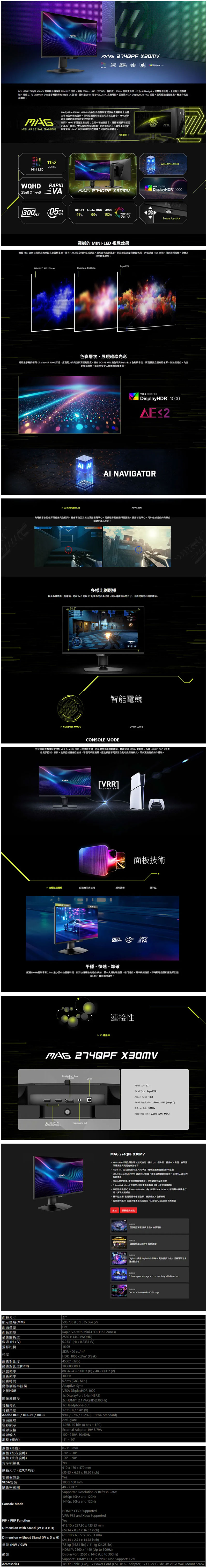 MSI MAG 274QPF X30MV〈2H1P/VA/300Hz/HDR1000/HDMI 2.1〉Mini-LED分區控光 價值$12,900