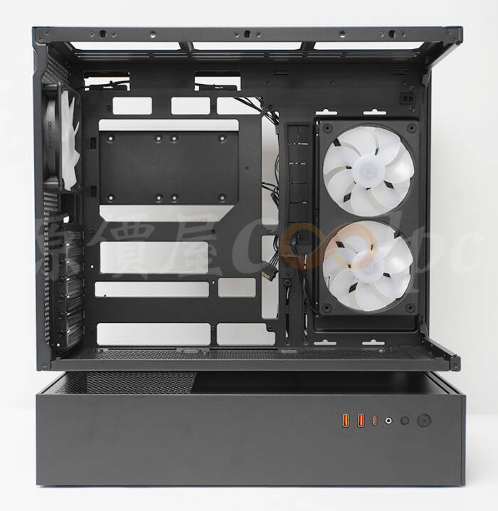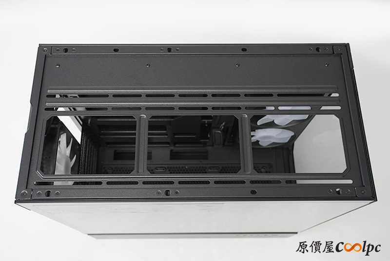 頂部有做挑高設計,並將風扇支架向前偏移,避免與主機板散熱模組衝突。支援120/140mm風扇最多3顆,也能安裝360/280/240/140/120mm水冷散熱器。