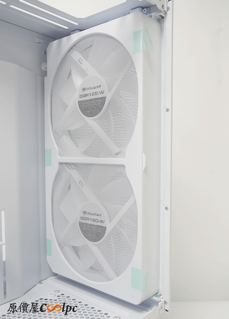前風扇內側多一層濾網防塵,磁吸式的門可以直接打開,裡面看到風扇型號是COUGAR DGR160-W。