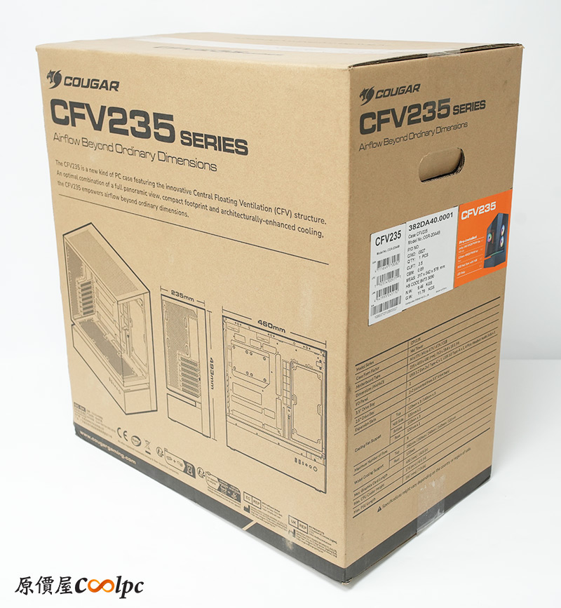 封面機殼簡圖已經可以看出一點懸浮設計,下方有斗大的CFV235系列字樣,兩側是簡易規格表與多國語言版本機殼特色,後方則有多角度機殼簡圖及尺寸標示。