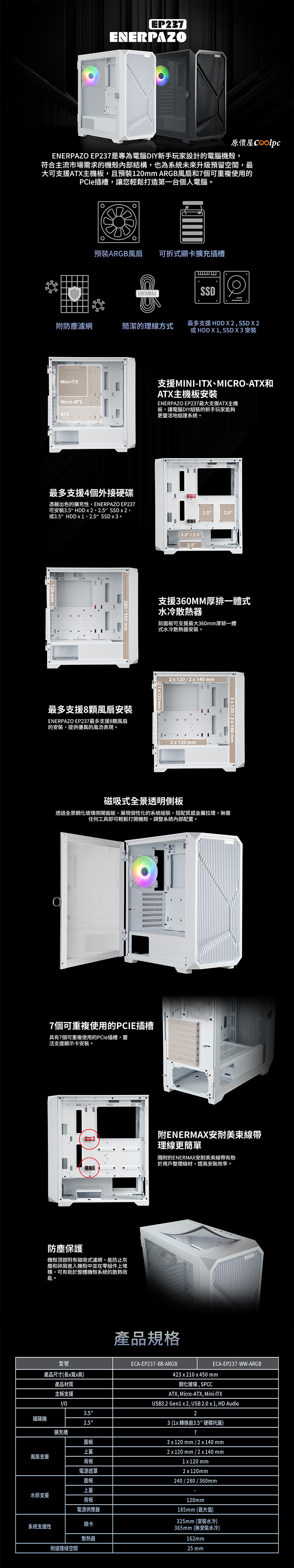 這咖保銳ENERPAZO EP237機殼便宜歸便宜,用料還是相當的扎實,由堅固的SPCC鋼材製作,搭配側面鋼化玻璃面板,想展示零件、RGB燈光效果都沒問題。前方還有大面積格柵造型進氣孔,支援3x 120mm/2x 140mm風扇擴充,其他還有頂部2x 120/2x 140mm、電源艙上2x 120mm、後方預裝1x 120mm ARGB風扇,總計最多8顆風扇輔助散熱,內部空間也是寬敞,空氣流通暢行無阻。主要零件最大相容ATX主機板,散熱器高度162mm,顯卡長度365mm(無安裝水冷)/325mm(安裝水冷),電源長度185mm,也能容納360/280/240mm水冷排;儲存裝置最多3顆2.5″ SSD,最多2顆3.5″ HDD。機殼還有25mm背線空間與魔鬼氈束帶等理線設計,在外也附上磁吸濾網防止灰塵進入,整體可以說是面面俱到,有興趣的朋友別錯過了。