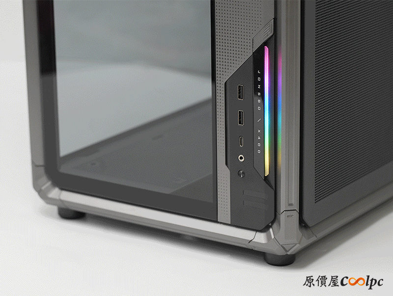 I/O提供2x USB3.2 Gen1 Type-A、1x USB3.2 Gen2 Type-C、1x Audio& Mic Combo jack連接埠、POWER、RESET按鈕,一旁標示喬思伯JONSBO/ X400字樣,還有一個RGB燈條做綴飾喔。
