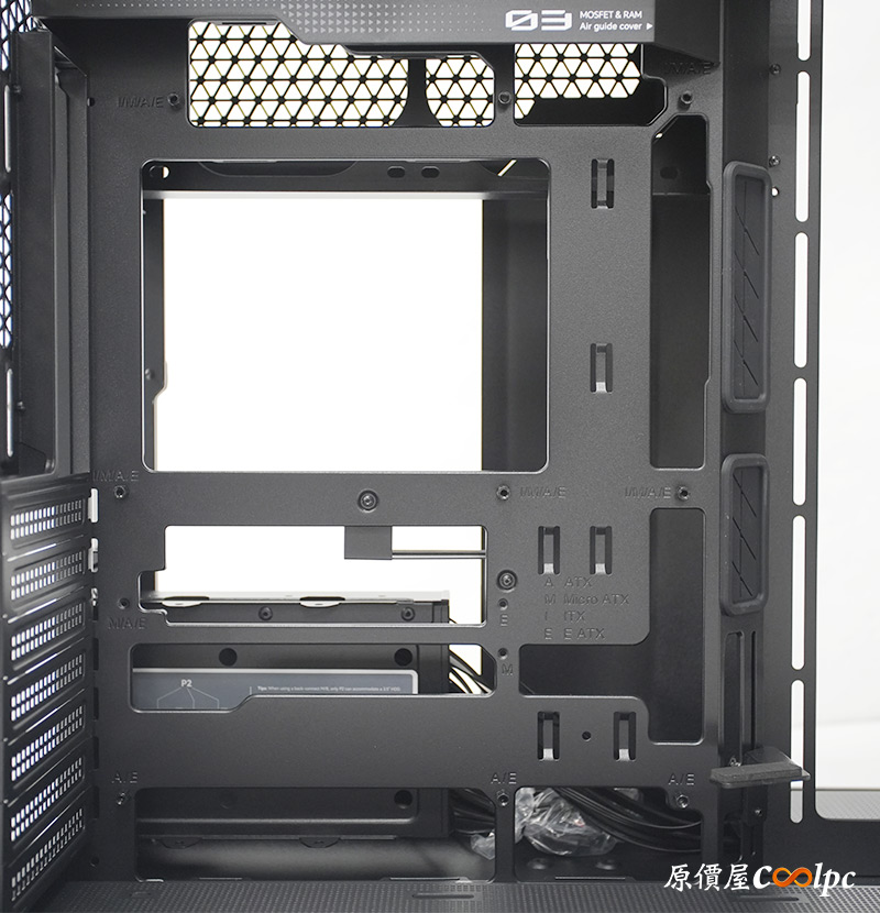 後艙也是巧妙運用空間,打開馬上就會看到兩片功能面板,01是理線板直接把大多線材蓋住,02則是導流板,位置來看應該是給主機板後方的風扇使用。