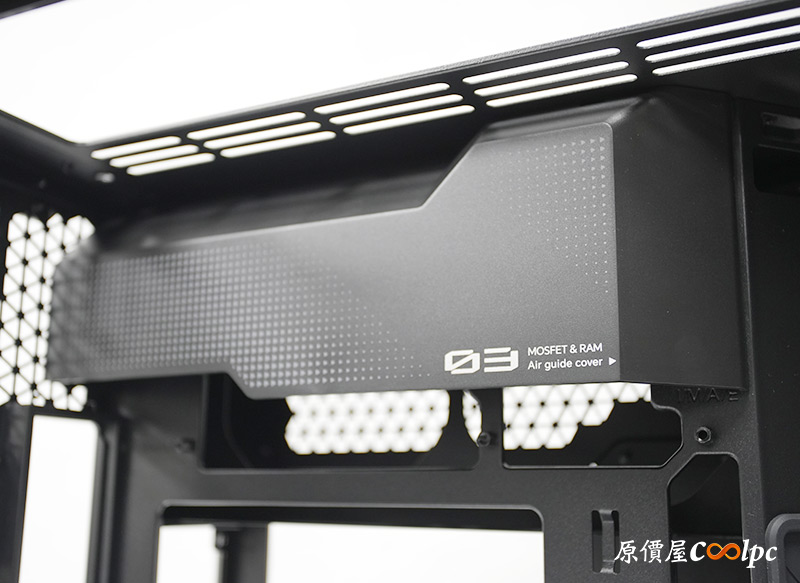 主板後方的風扇支架能裝2顆120mm風扇,空氣經由右側板與導流板後被吸入,吹到前方時再透過導流遮罩集中到主機板MOSFET和RAM的位置,做到更全面的溫度調節,讓電腦運作更穩定。