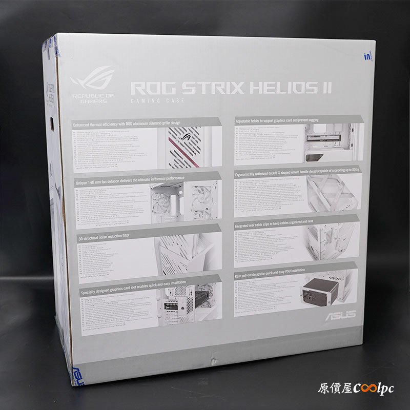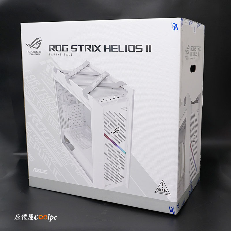 外盒採用白色搭配 ROG 電馭 LOGO 組成,上方為機殼型號,ROG STRIX HELIONS II,正中間則是機殼實體樣貌,右下角還有一個鋼化玻璃注意事項,搬運時請小心輕放。