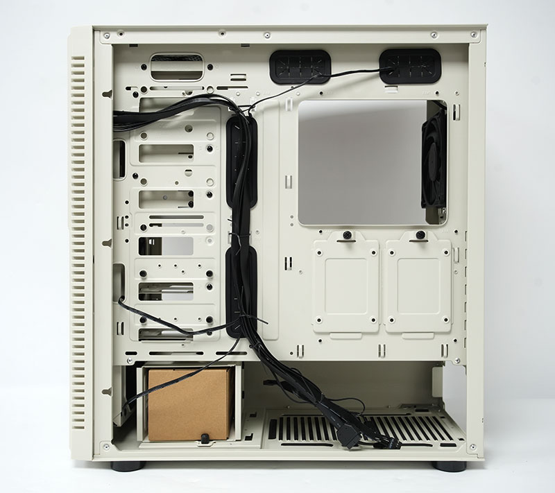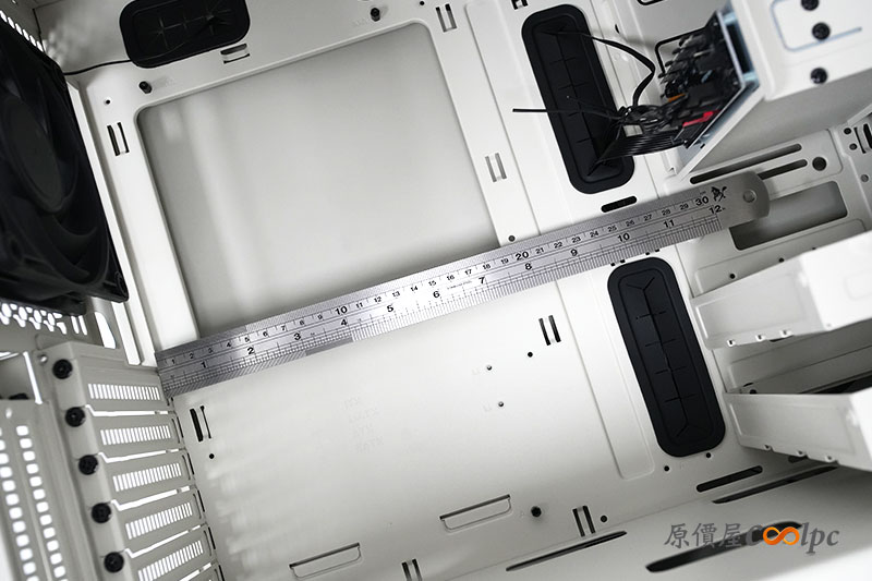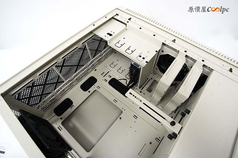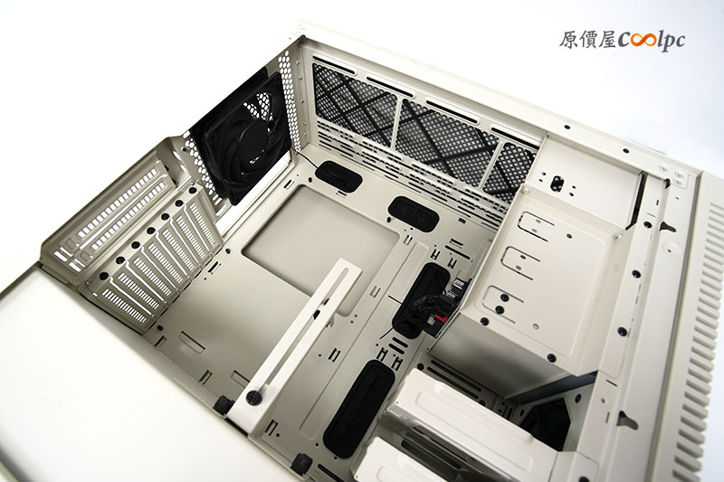 來看看格局方正的機殼內部吧。算是寬敞的設計,甚至在機殼的頂端位置,還能安裝最大 360mm 的水冷排。真的是能滿足中階以上玩家的要求。