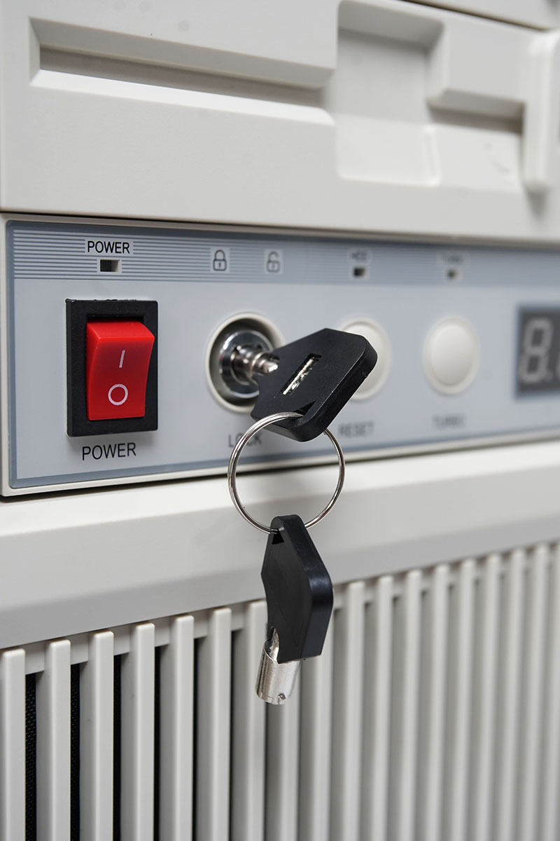 正面細節特寫,可見紅色電源與可上鎖的鎖頭設計,可針對隔壁的重啟鍵做保護,另外還有經典的 Turbo 鍵設計。