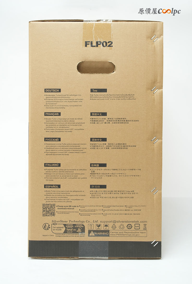側邊標籤清楚標示 FLP02 型號與基本規格、多國文字說明,還有象牙白款式的貼紙註記。