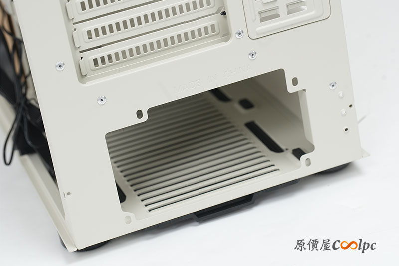 機殼底座,電源艙的下方也有長形的散熱孔位設計,也附有一組可拆卸的濾網。