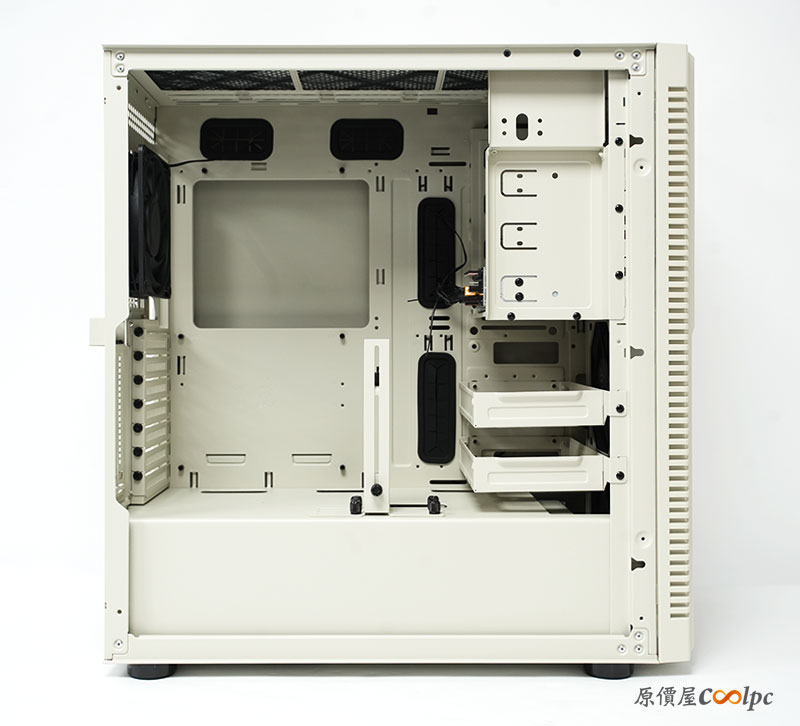 來看看格局方正的機殼內部吧。算是寬敞的設計,甚至在機殼的頂端位置,還能安裝最大 360mm 的水冷排。真的是能滿足中階以上玩家的要求。
