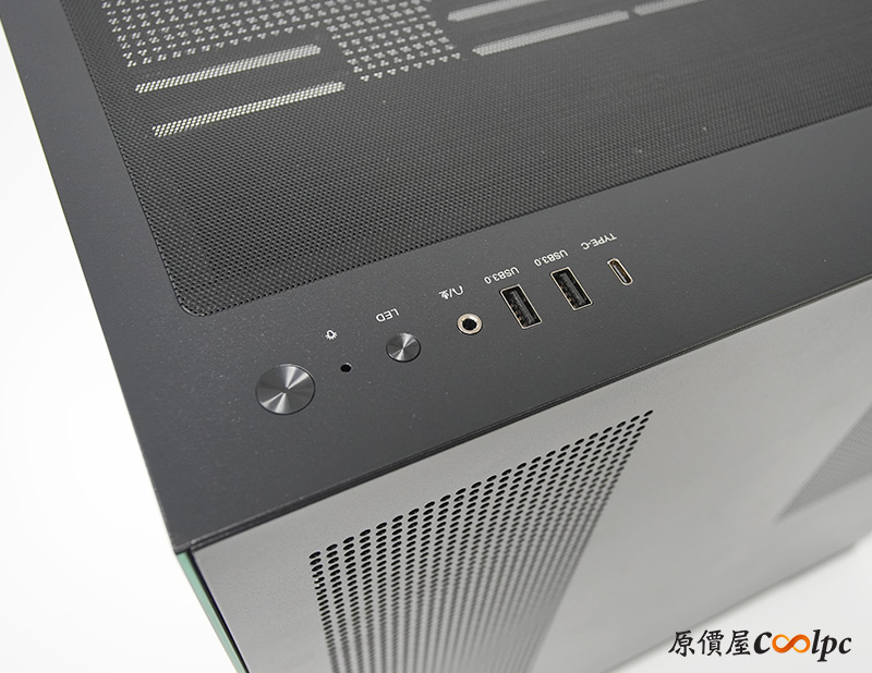 I/O也可以在上方找到,依序分別是POWER鍵、硬碟LED指示燈、LED鍵、AUDIO 3.5mm插孔、USB3.2 Gen1 Type-A*2、USB3.2 Gen2 Type-C(20Gbps)。