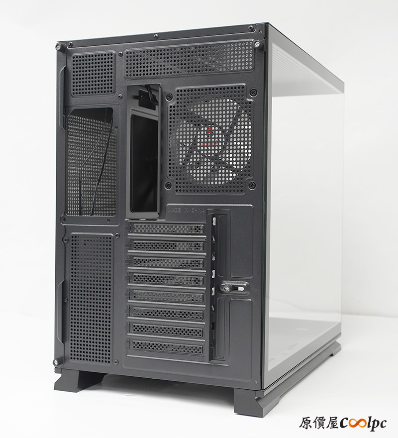 後方內建1顆120mm風扇,提供8組PCIe 擴充槽,左邊的孔洞則是電源供應器開孔。