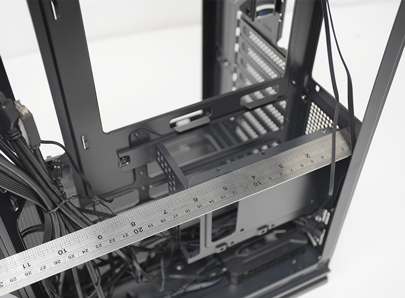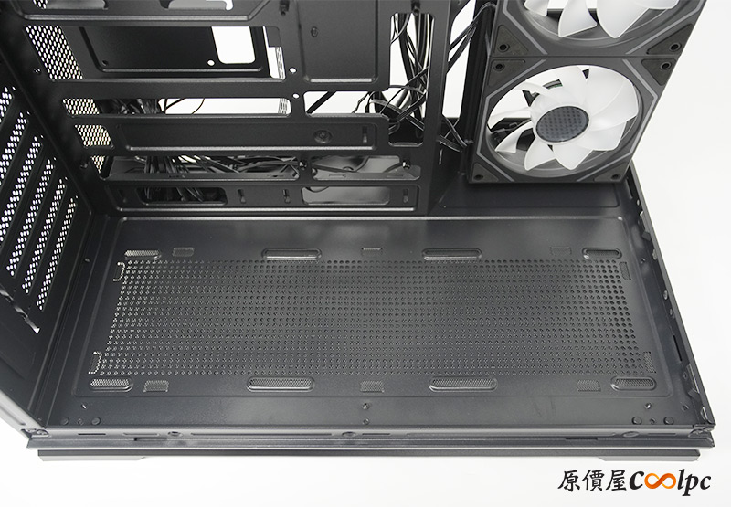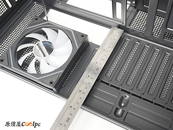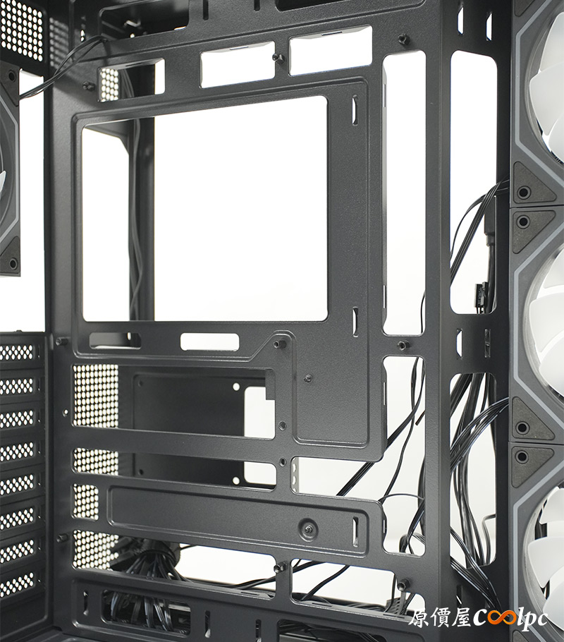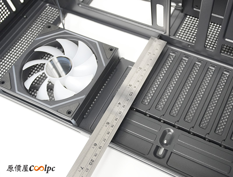 上方風扇支架明顯有向左側偏移,避免與主機板上的散熱模組衝突,這裡可以安裝3顆120mm或2顆140mm風扇。