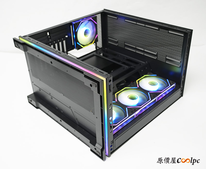 側邊3顆120mm ARGB風扇是反向扇設計,不僅能引導新鮮空氣進入,內側這面的ARGB效果也較好,仔細看還能發現風扇中央有無限鏡像效果,風扇框架上有ARGB燈條,框架側邊也是鏡像設計。