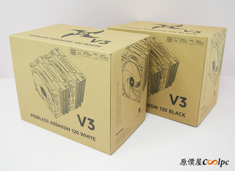 經過全面效能提升,利民PEERLESS ASSASSIN 120 V3散熱器以嶄新姿態登場,不僅將風扇轉速拉高到2000RPM±10%,最大風量70.84 CFM,最大風壓2.63mm H2O都比過去的PEERLESS ASSASSIN 120還要高,並且將風扇噪音壓在29.8 dBA,強力散熱的同時也兼顧環境品質。散熱器外型維持雙塔雙風扇結構,鋁金屬質感頂蓋,6根6mm AGHP逆重力導熱管,搭配C1100純銅鍍鎳底座,快速將熱能從CPU帶出,接著透過導管、鰭片、風扇快速排熱,讓系統運作更穩定,CPU效能也能正常發揮喔。這次原價屋特別帶來PEERLESS ASSASSIN 120 V3散熱器給大家認識,有黑白兩色可供選擇,近期有意組新電腦或是升級散熱器的朋友們,一定不要錯過今天的開箱介紹啦。