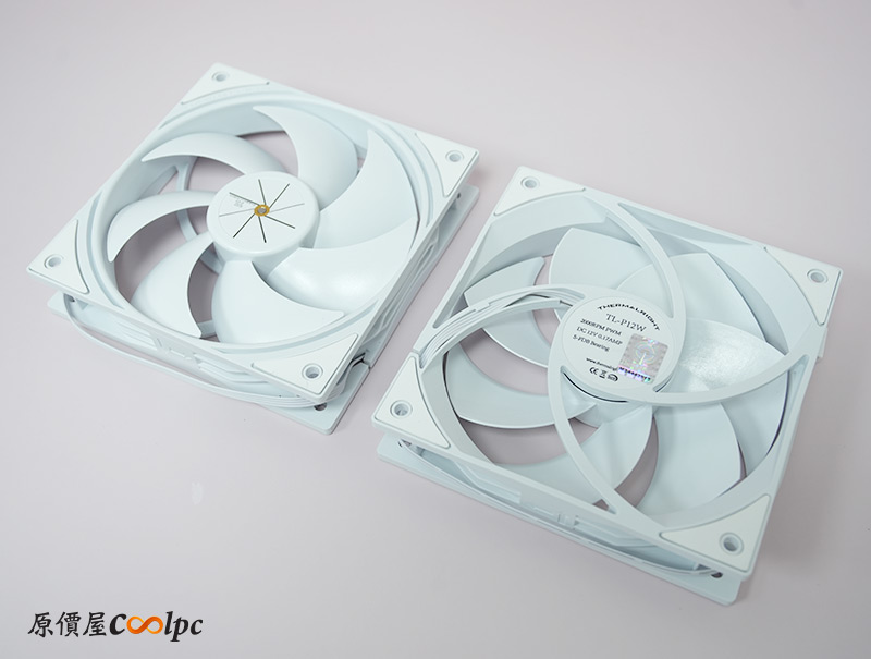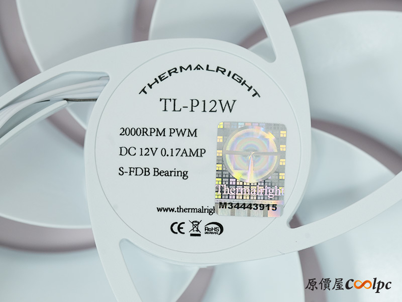 兩顆風扇選用Thermalright TL-P12W,搭載S-FDB軸承,轉速高達2000RPM,相比過去幾款PA120系列散熱器都還要高,扇葉中間印上Thermalright TL字樣,框架刻上Thermalright大寫字體,防震的膠墊也都沒少,並由小4Pin介面供電。