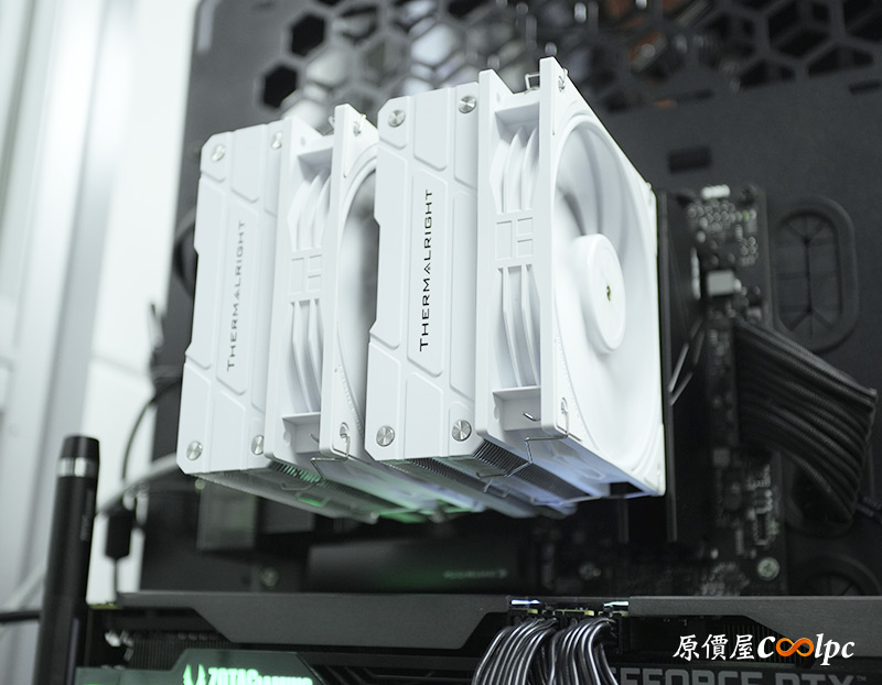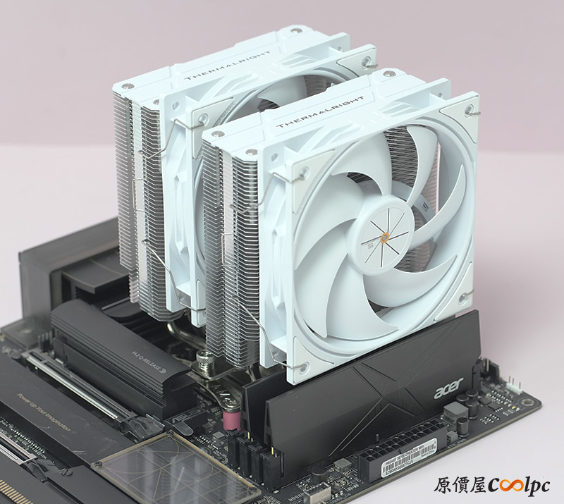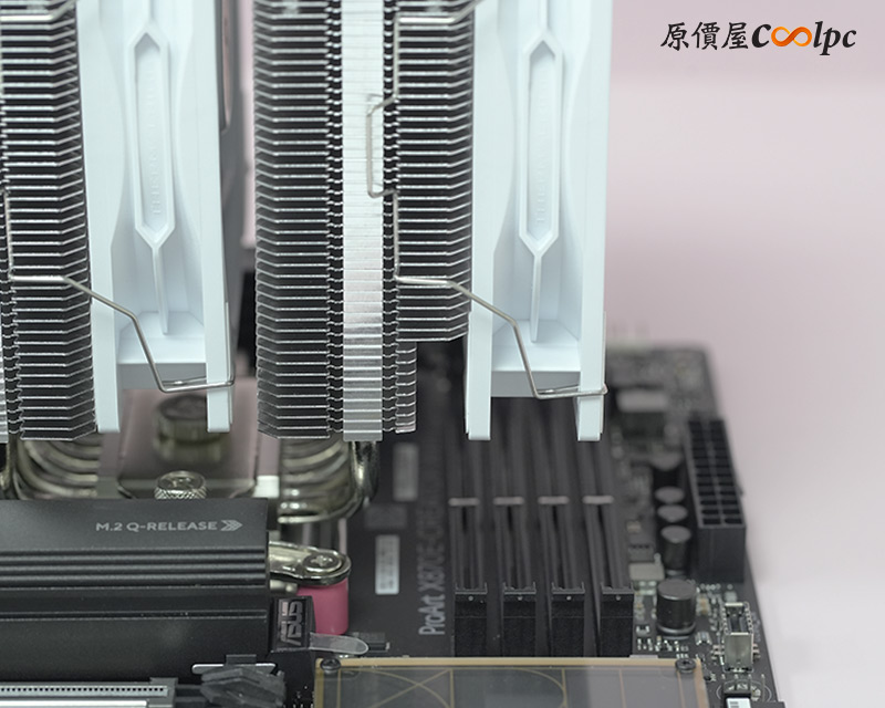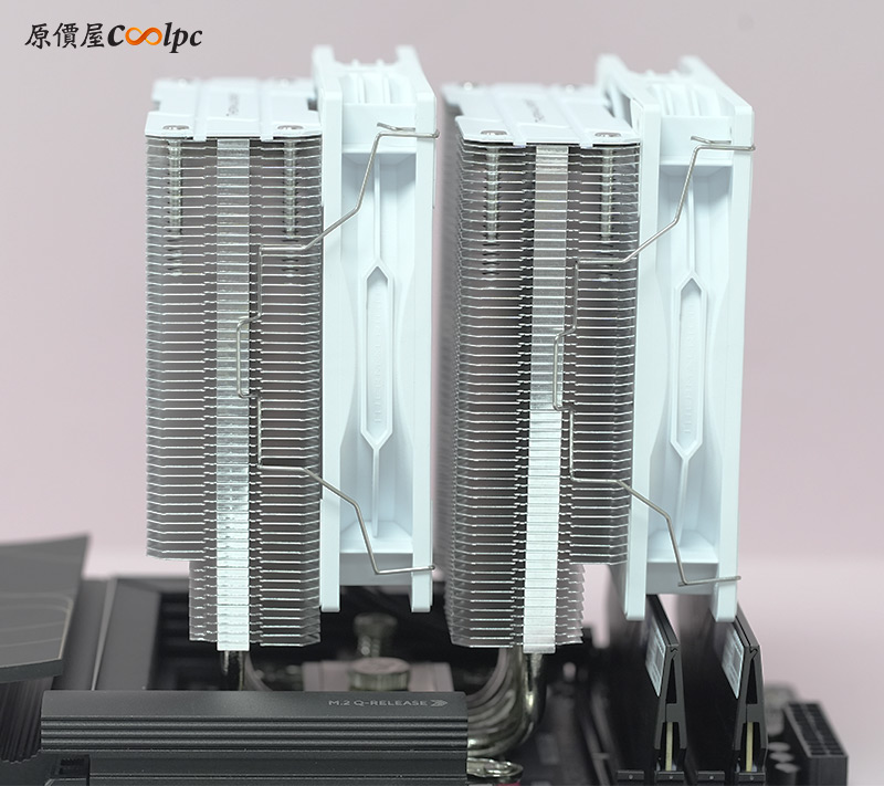散熱器本體採用雙塔結構,搭配剛剛的兩顆TL-P12W風扇散熱,從側邊看並沒有記憶體偏移設計,但從另一側看就稍微有往顯卡偏移一些,猜測是避免與主機板MOSFET散熱模組衝突。