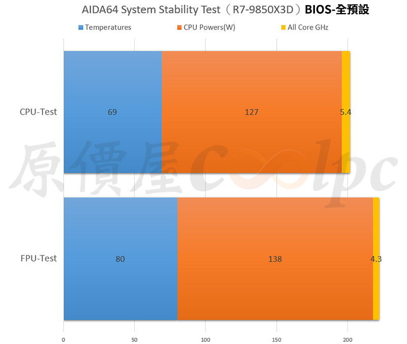 AMD Ryzen 7 9850X3D FPU 項目壓力測試約 5 分鐘,當前全核時脈:4.3GHz、功耗:138W,當前溫度:80 度。