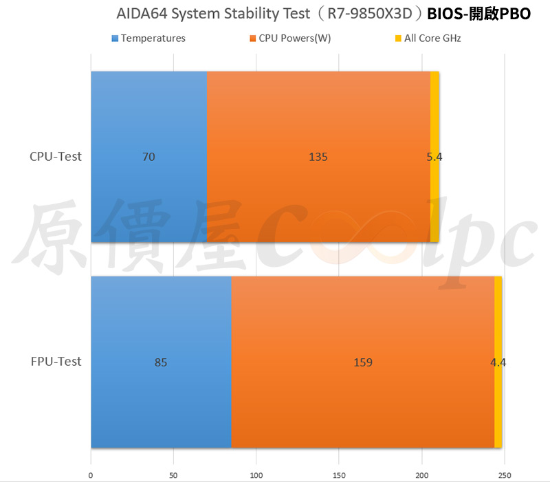 AMD Ryzen 7 9850X3D FPU 項目壓力測試約 5 分鐘,當前全核時脈:4.4GHz、功耗:159W,當前溫度:85 度。