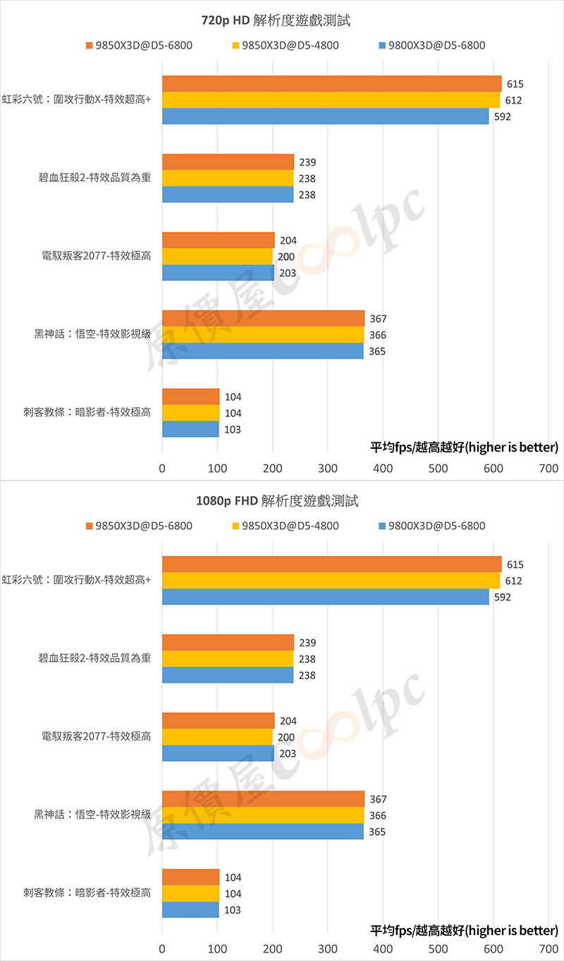 遊戲基準測試,針對 720p、1080p,平均 fps 越高越好!從測試結果來看,9800X3D 和 9850X3D 的性能差異確實不大,同時我也測試了 DDR5-4800 和 DDR5-6800,以 9850X3D 來說確實是無關記憶體時脈,遊戲表現都很優秀。礙於時間關係,未來有機會再多測試 1% Low、0.1% Low fps 給各位參考。