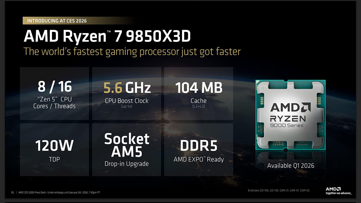 AMD Ryzen 9000X3D 使用 Zen 5 架構 + 台積電 4nm 工藝、第二代 3D V-Cache 技術,改良設計將 3D V-Cache 放置於 CCD 下方,讓 CCD 能直接接觸頂蓋增強導熱,改善積熱的同時也讓高時脈和超頻性得以實現!同樣具備 Radeon Graphics 內顯功能。既然是同屬 Socket AM5 平台,老規矩,佛系蘇媽讓 AMD 600/800 系列主機板更新 BIOS 就能原地飛升!但小編也要再次囉唆一下:除了升級主機板 BIOS,也建議搭配 Windows 11 25H2 最新系統,讓軟硬體完美契合!我知道你可能以為 AMD 很跩,但是你想想看,在 9850X3D 遊戲之神面前,所有對手都只是在爭奪「第二名」的資格而已。不跩它一跩怎麼對得起自己呢?