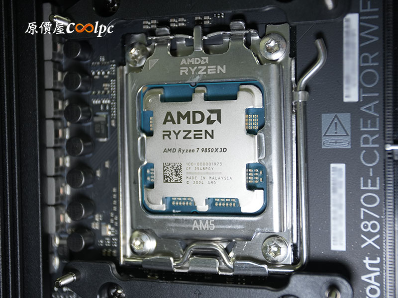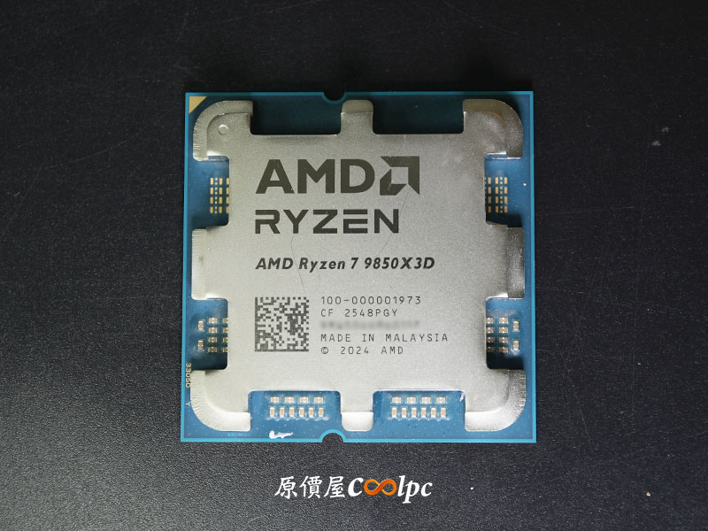 AMD Ryzen 7 9850X3D 為 AM5 架構(LGA1718),從處理器正面資訊可得知是由馬來西亞組裝!代工雖然沒標示,但閉著眼睛也知道是台積電 MADE IN TAIWAN!