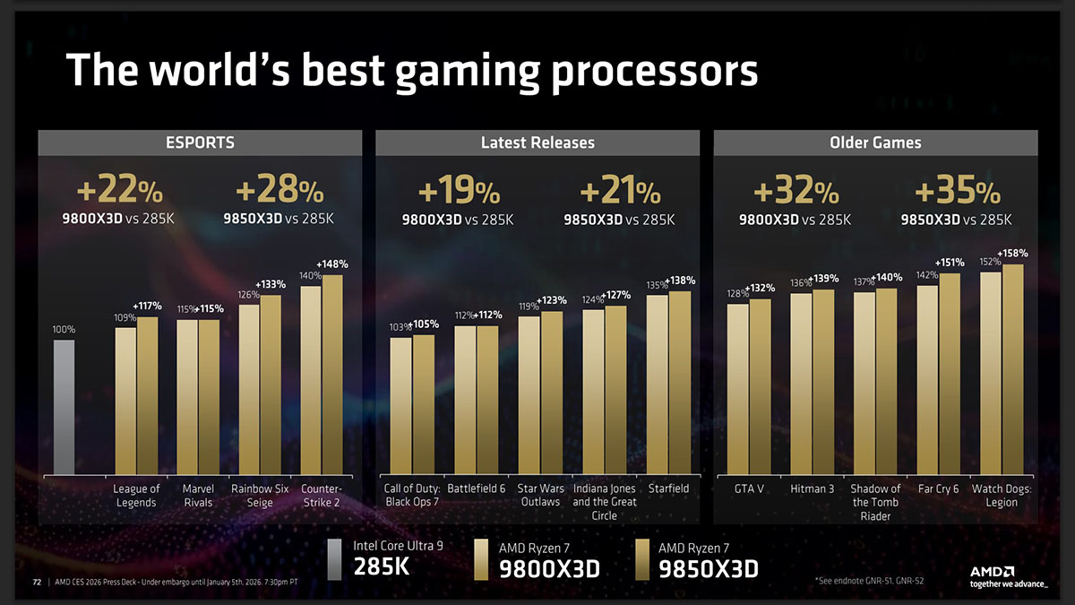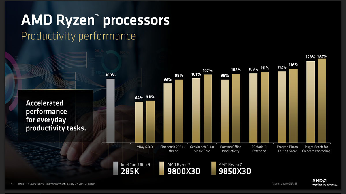 (點圖放大)根據官方簡報,9850X3D 對上隔壁棚最新的 Core Ultra 9 285K,展現了殘酷的遊戲效能差距。在電競遊戲中平均領先達 28%,而在《柏德之門 3》這種吃重 CPU 運算的大作,領先幅度甚至衝到誇張的 60%!這不只是領先,更是對手之間的技術斷層…