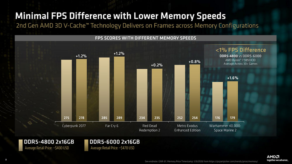 AMD 簡報還有一張圖表,針對 Ryzen 7 9850X3D 處理器,在超過 30 款遊戲的綜合測試中,DDR5-4800 與 DDR5-6000 記憶體時脈的平均效能差異小於 1%。拜第 2 代 3D V-Cache™ 所賜,足夠大的快取容量讓 CPU 絕大多數的資料運算都能在快取內直接完成,有效消彌了記憶體延遲與頻率帶來的瓶頸,也意味著當玩家選擇 X3D 處理器,記憶體的預算配置更加自由。