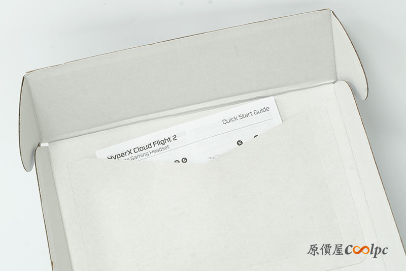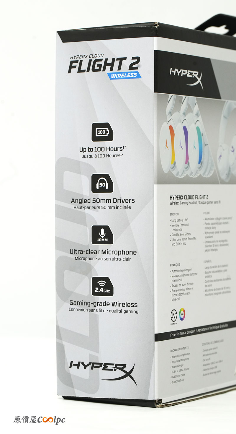 HyperX Cloud Flight 2 以白色系清爽外盒登場,產品外觀與主要特色一目了然。正面標示核心功能,第一眼就能感受到這款耳機的定位相當完整。