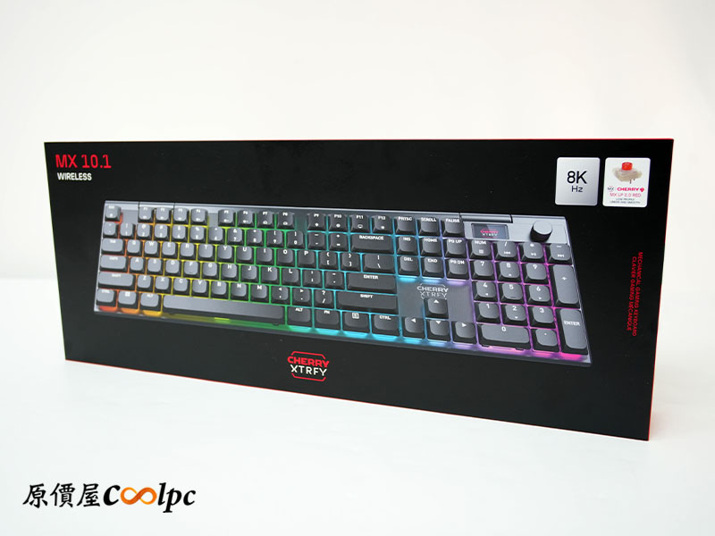 包裝維持 Cherry 辨識度超高的黑底櫻桃紅配色。外盒右上角直接標示 8K Hz 輪詢率(有線)和 MX LP 2.0 紅軸,側面則強調三模連線、矮軸、RGB 燈效等產品重點。整個外盒做得像高質感禮盒,是很貼合的硬紙盒,側邊特別設計了開孔來提升開箱體驗。