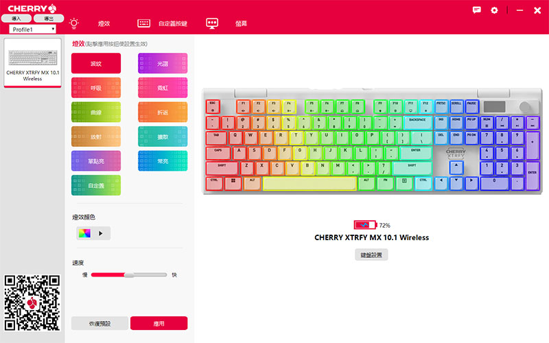 如果你需要更直覺的設定介面,那麼可以直接到官網下載 CHERRY Utility 軟體(點我前往)。有圖形化介面就是方便!軟體主要提供燈效、按鍵自定義、LCD 顯示這三大核心選項供你設定調整。