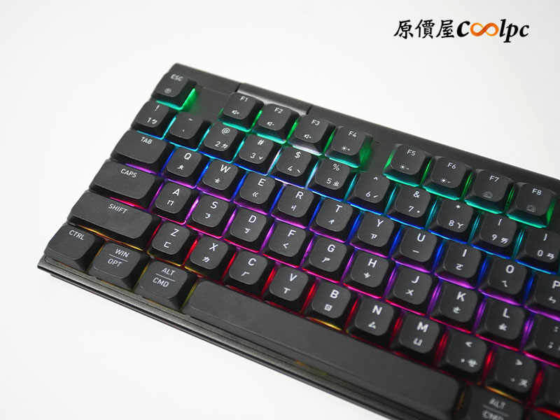 鍵盤採用 PBT 鍵帽,具備抗磨損又耐用的特性。最重要的是,鍵帽上的中文字根可不是印刷上去的!它採用跟英文字母一樣的二色成型工藝,讓耐用度、手感和字體清晰度都更有保證!