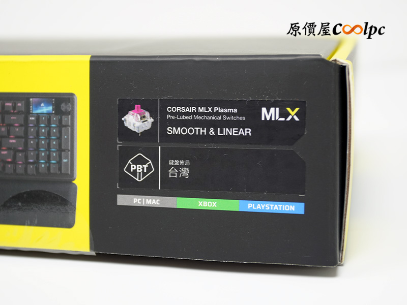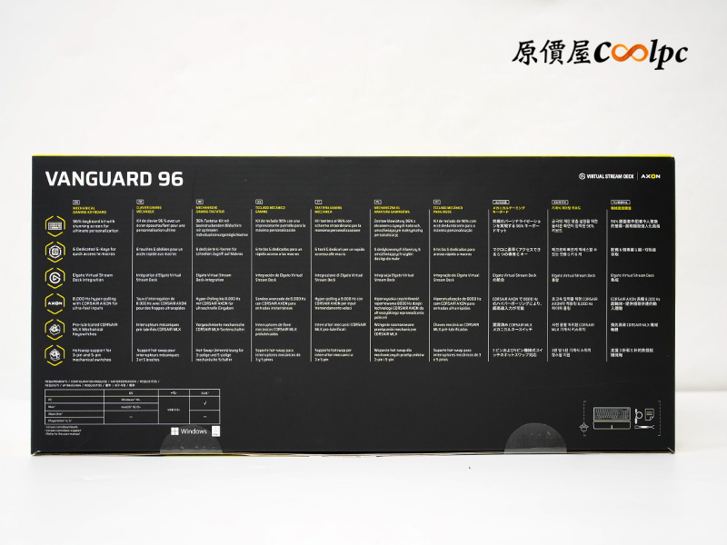 外盒依然是海盜船標誌性的亮黃配黑色,正面直接給你大大的滿版實體照!側邊清楚標示了軸體、中文鍵帽,還有大家最在意的多平台支援資訊,轉到背面則有更詳細的多國語言特色介紹。