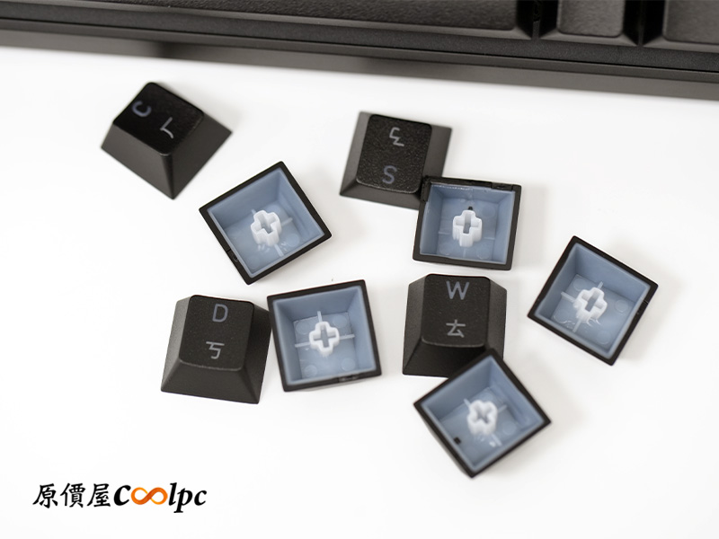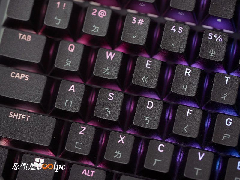 鍵帽採用 PBT 二色成行工藝,英文和符號都有透光,注音則是印刷上去的。