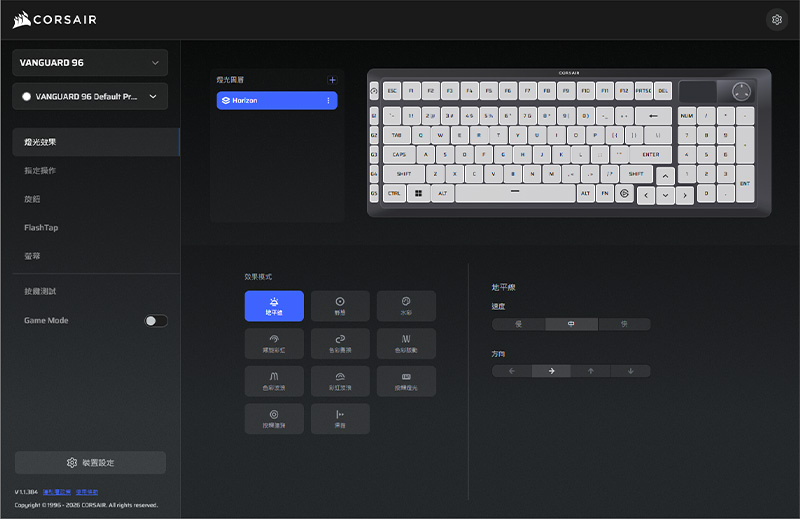 燈光效果內建了地平線、水彩、螺旋彩虹等共 11 種預設模式,選擇非常豐富。除了選模式,你還能細部調整燈效流動的方向與快慢,讓每一位玩家都能隨心所欲地打造出最符合自己桌搭風格的視覺效果。