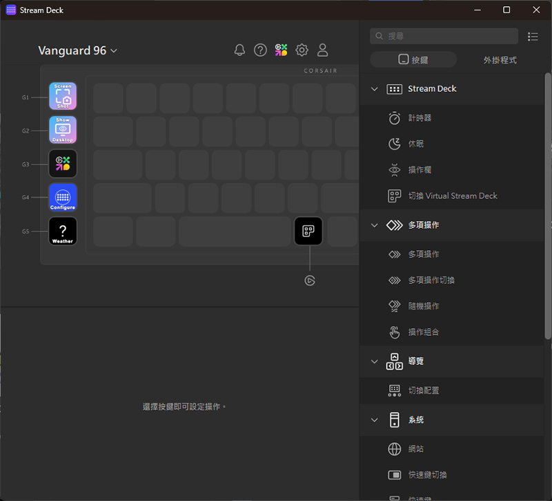 對於有直播需求的玩家,安裝 iCUE 後即可連動 Stream Deck 軟體,進一步自訂這 5 顆 G 鍵的功能。除了基本的導播控制,它還能透過外掛程式串聯 Spotify、Adobe Photoshop 或 VT Studio 等常用軟體。將複雜的操作簡化成一鍵觸發,讓你在直播過程中能更專注於內容呈現,輕鬆掌握每個細節。