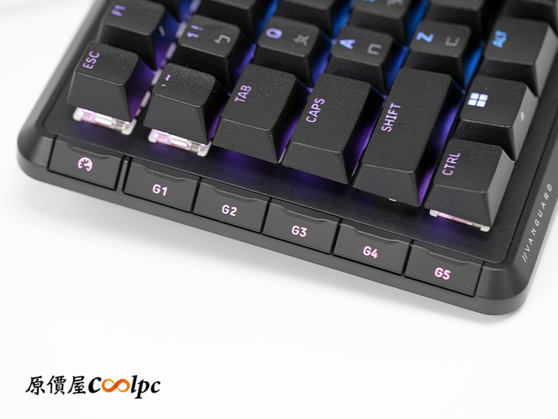 Vanguard 96 巧妙地把數字鍵跟方向鍵縮進來,並捨棄掉平常少用的功能鍵,讓整把鍵盤看起來更緊湊、更精實。這樣設計的好處是能在有限的空間裡保留最完整的輸入功能,桌面看起來也清爽許多。