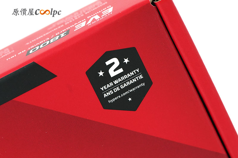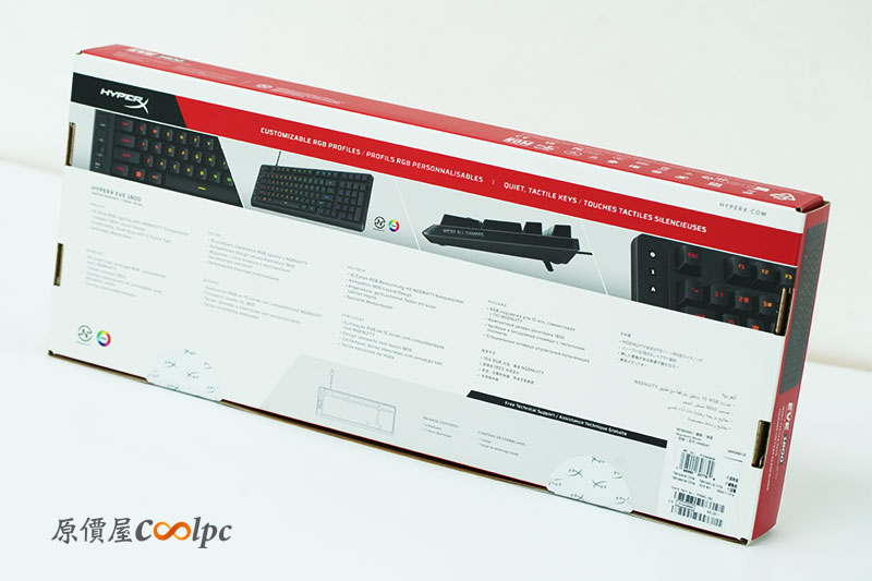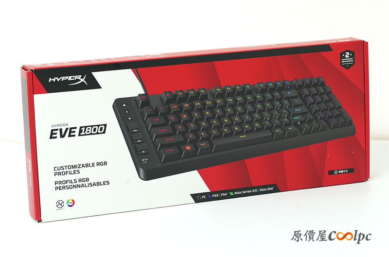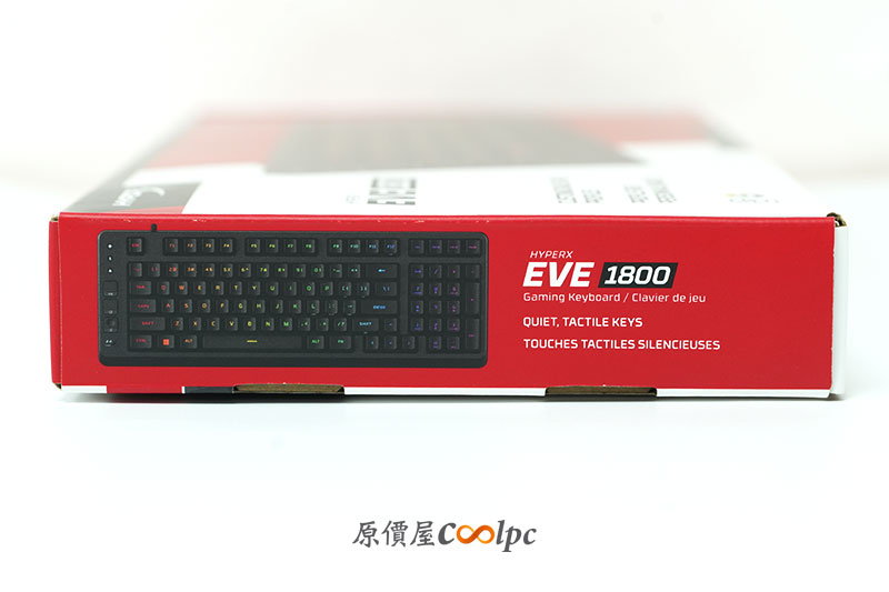 產品外盒正面,紅黑配色是 HyperX 一貫的電競風格設計。從包裝設計就能看出 HyperX 的品牌識別,採用醒目的紅黑配色與產品實拍圖,正面清楚標示鍵盤外觀與型號 Eve 1800。