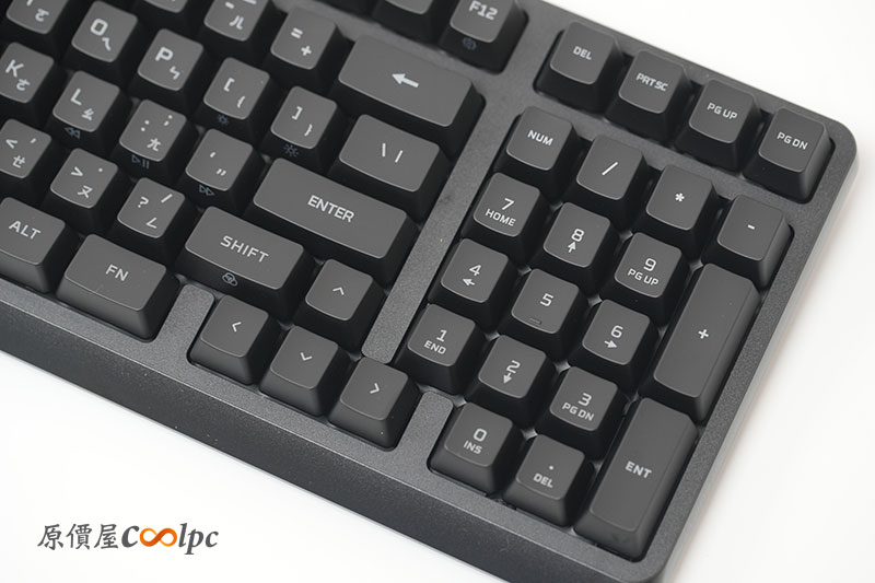 鍵盤採用 1800 Layout,這種配置可以說是 全尺寸鍵盤與 TKL 的折衷設計。也保留完整的數字鍵區,但縮短整體寬度,讓桌面能騰出更多滑鼠空間。