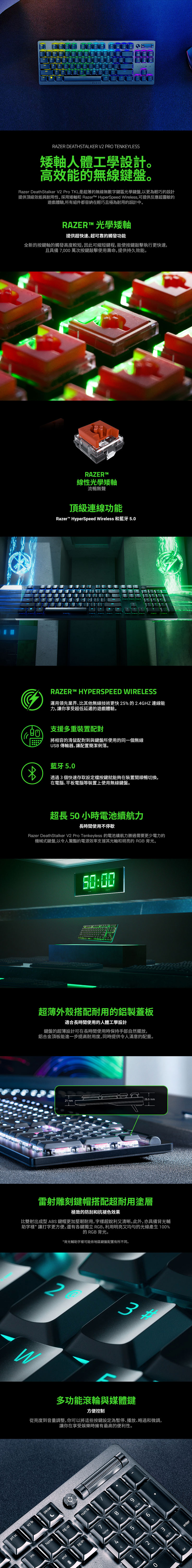 別再等雙 12 當天人擠人了!懂挑的玩家都知道,雙 12 前的暖身活動就有不少好康可以先下手!像這把為勝利而生的 Razer DeathStalker V2 Pro TKL 絕對是必收神裝!80% TKL 佈局是專業玩家公認的最佳配置,能為你騰出寬敞的空間甩動滑鼠。它內建的光學矮軸行程短、反應快,在槍林彈雨的戰場上讓你反應更快速;高達 7,000 萬次按鍵敲擊壽命讓你用得更久、打得更猛!全機採用高質感 5052 鋁合金上蓋,加上超耐用鍍膜鍵帽讓它更耐用。當然這些厲害的都只是讓你更順手,最強的是它的三模無線技術!搭載 Razer HyperSpeed Wireless 技術、藍牙 5.0,以及 Type-C 有線連接,讓你自由切換!0.291 毫秒的超低延遲指令快如閃電,續航力更驚人地高達 200 個小時,連續激戰好幾天都不是問題!另外它還支援 HyperSpeed 多重裝置配對,只需一個接收器就能搞定鍵盤和滑鼠,如果你剛好也用雷蛇的無線滑鼠,那就可以湊一組完美套裝啦~但不是每一款無線滑鼠都支援,大家可以先看一下官網列表(點我查看),其他像是 Razer Chroma RGB 燈效、錄製巨集等功能,都可以到 Razer Synapse 4 設定。右上角那顆多功能媒體鍵和媒體滾輪也很實用,隨時調整音量或亮度,讓這把鍵盤實用性與質感兼具!
