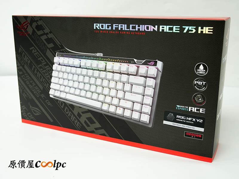 (點圖放大)這次開箱的是白色 ROG Falchion Ace 75 HE HFX V2 磁軸的版本!外盒依舊是 ROG 標誌性的紅黑配與經典圖騰,中間放了產品彩色示意圖,右上角的產品名稱則是用金屬質感印刷。右下角直接標出這把鍵盤的重點:包括原廠預潤軸、PBT 鍵帽,以及最核心的 ROG HFX V2 磁軸,當然也標明了是繁體中文配置。盒裝側面印了不少職業戰隊的標誌,這代表它是真的陪著許多選手拿下過勝利,是真正的電競神器!