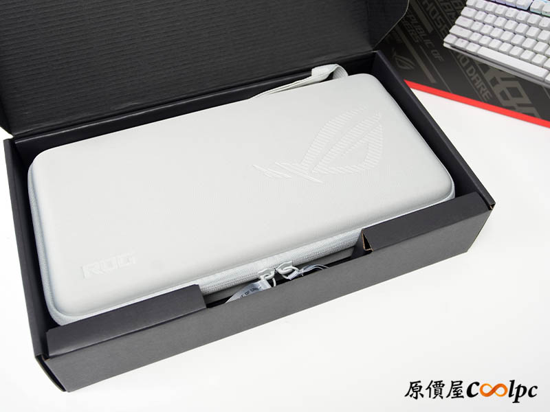 (點圖放大)內附的硬質便攜保護包質感很不錯,外層用的是滑順的佳績布材質;這裡有個小細節,黑色款附的是黑色包,而我們這次開箱的白色款則是搭配淺灰色唷!打開包包後,會看到鍵盤本體還有用布質收納袋保護著,這保護做得很夠!底下則是有針對拔軸器、連接線與說明書設計的專屬收納槽,不管是出國比賽還是去朋友家網聚,直接一包帶走就搞定,對有外出需求的朋友來說非常方便。
