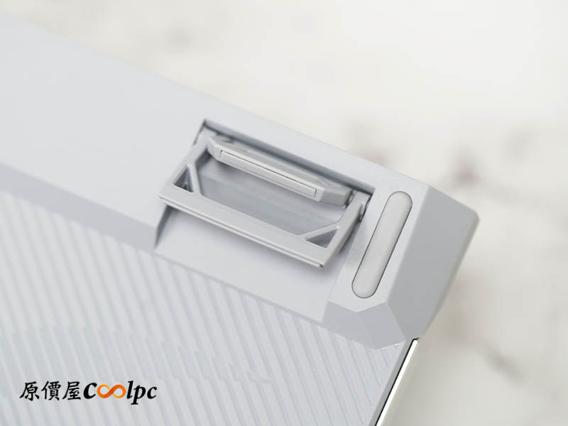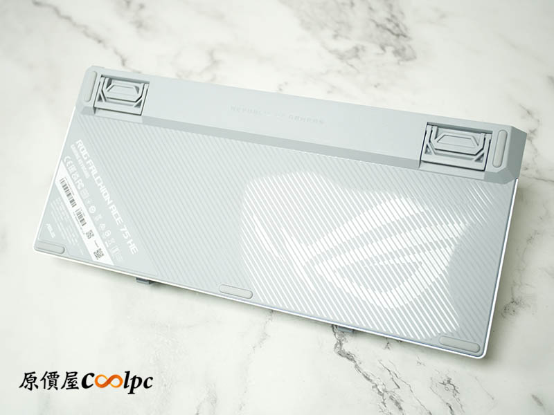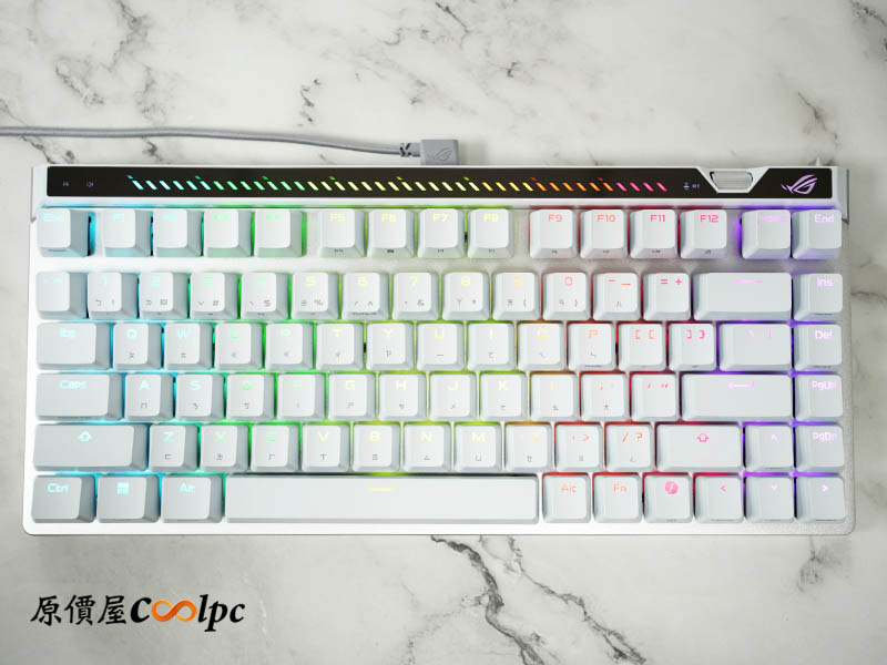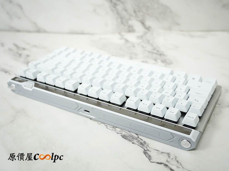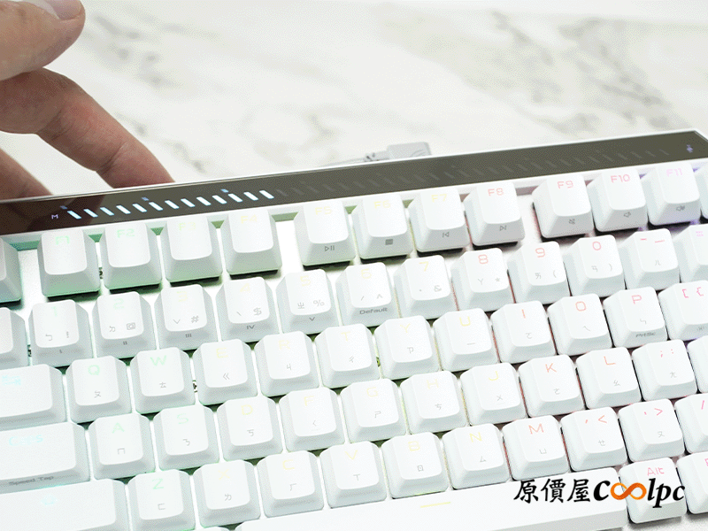 ASUS ROG Falchion Ace 75 HE 採用 75% 配列設計,最上方的 F 功能鍵做了微幅區隔,而方向鍵與功能鍵則緊湊地整合在字母區旁。這樣的配置讓整體視覺非常整齊洗鍊,不過對於習慣全尺寸或 80% 鍵盤的玩家來說,第一次上手可能需要稍微適應一下。頂部那一條醒目的鏡面裝飾可不只是為了好看,它其實隱藏了實用的顯示功能,這部分我們留到後面再詳細揭曉!