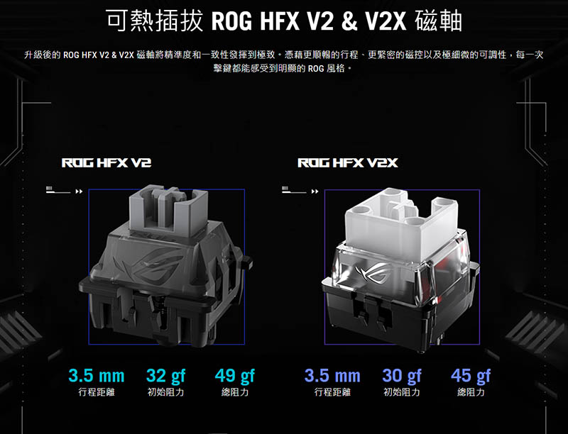 另外還有搭載 ROG HFX V2X 磁軸的版本,現在已經在線上估價系統正式販售!簡單來說就是 HFX 機械軸的磁軸版,延續經典又獨特的 X 架構設計,而且 HFX 機械軸它在玩家間評價一直都很穩定,幾乎沒有晃動問題;如果你用過 HFX 機械軸、也喜歡那手感,那各位可以好好考慮一下!