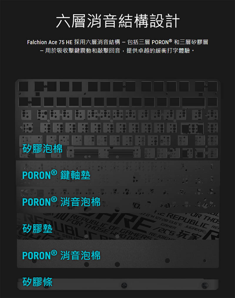 內部採用六層消音結構,包括三層 PORON 消音泡棉和三層矽膠層用於吸收擊鍵震動和敲擊回音,屬於類 Gasket 的設計。