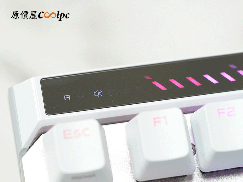 首先看到左上角的多功能切換鍵與帶有刻度的觸控條,功能涵蓋了系統音量、媒體曲目切換以及 RGB 燈效亮度調整,切換時也都會亮起對應的燈號;最後一個 M 檔位則支援全自定義,原廠預設是滑鼠滾輪功能,拿來滑網頁意外地順手!如果想要更進階的玩法,玩家也能透過網頁版驅動 Gear Link 進行深度自訂唷。