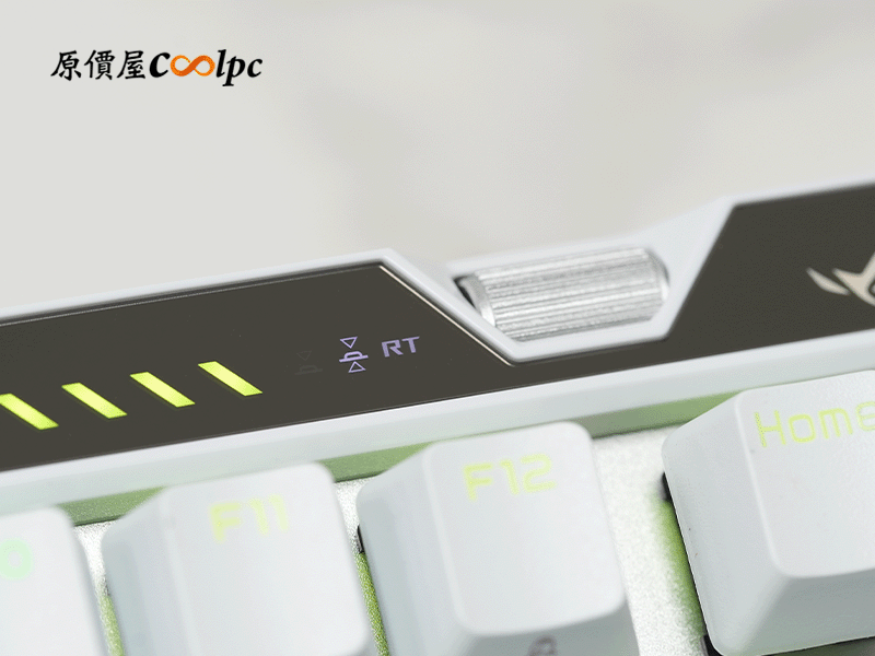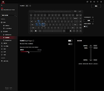 轉向鍵盤右側,這裡配置了 ROG 標誌性的 Rapid Trigger 實體開關,旁邊則是專門用來即時調整觸發點與 RT 靈敏度的滾輪。特別提醒一下,它不是音量滾輪喔! 調整時頂部的 RGB 燈條會同步顯示參數變化,讓你一目了然目前的設定數值,完全不需要縮小遊戲切換軟體。
